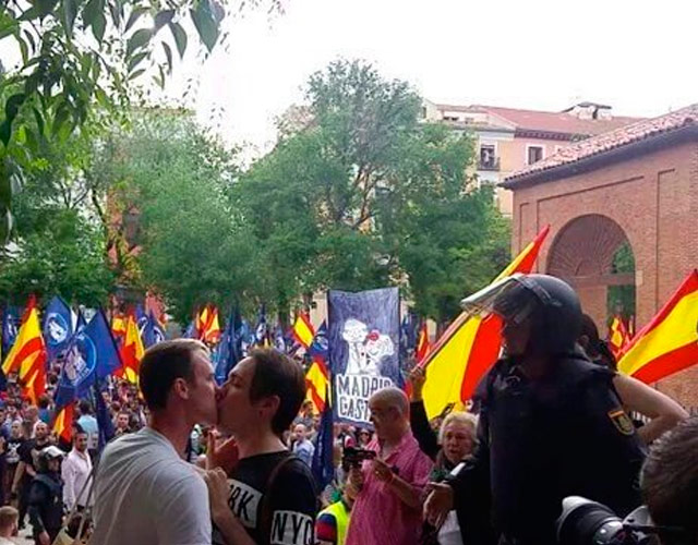 Pero la imagen del colectivo LGBT del fin de semana es sin duda esta: la policía detiene a la pareja gay que se besó delante de una manifestación neonazi. El sábado se manifestaron por el centro de Madrid centenares de neonazis del colectivo de ultraderecha Hogar Social Madrid, manifestación permitada por la Delegación del Gobierno en Madrid y que llegó a cortar la Gran vía. La tensión fue máxima en las calles de la capital, pero los protagonistas de la manifestación fueron los valientes jóvenes de la foto, David y Gregor, una pareja gay de chicos que se besó delante de la manifestación en la plaza del 2 de mayo.