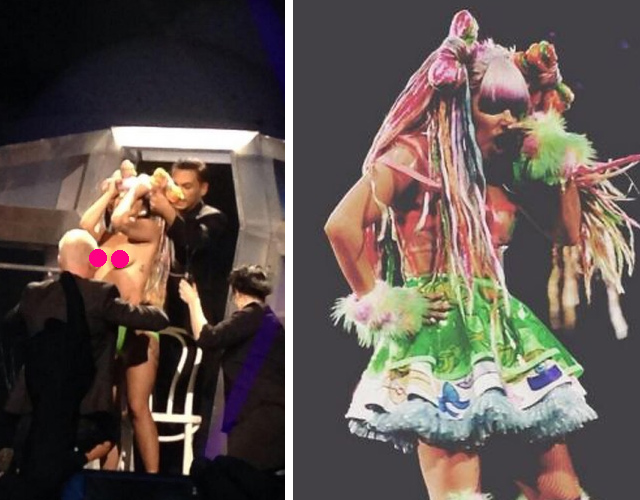 Por supuesto, no se ha podido quedar sin desnudarse delante de sus fans, en un cambio de vestuario rápido. Los looks son de lo más sorprendente: desde el rollo "seashell" de 'ARTPOP' a una especie de disfraz de pulpo, pasando por un disfraz de japonesa colorista.