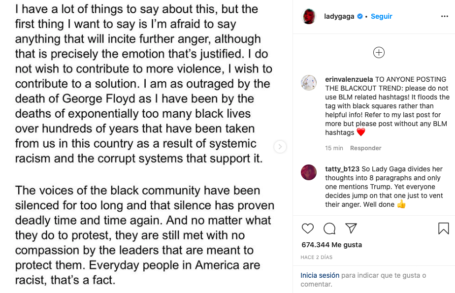 Lady Gaga se ha unido al coro de famosos pidiendo solidaridad con la comunidad negra tras las protestas nacionales. "Tengo muchas cosas que decir sobre esto", comenzó Gaga en un post de Instagram. "Pero lo primero que quiero decir es que tengo miedo de decir algo que incite a más ira, aunque esa es precisamente la emoción que está justificada. No quiero contribuir a más violencia, quiero contribuir a una solución." "Estoy tan indignada por la muerte de George Floyd como lo he estado por la muerte de demasiadas vidas negras durante cientos de años que nos han sido arrebatadas en el país como resultado del racismo sistémico y los sistemas corruptos que lo apoyan", continuó. "Las voces de la comunidad negra han sido silenciadas durante demasiado tiempo y ese silencio ha demostrado ser mortal una y otra vez. Y no importa lo que hagan para protestar, los líderes que se supone que los protegen siguen sin tener compasión. Todos los días la gente en América es racista, eso es un hecho. Ahora mismo es un momento crítico para que la comunidad negra sea apoyada por todas las demás comunidades para que podamos poner fin a algo que está intrínsecamente mal por la gracia de Dios o de cualquier creador en el que creas o no".