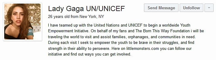 Porque mientras otras popstars colaboran de forma tangencial en diversas entidades benéficas, la Germanotta se mete de lleno en su proyecto para Unicef: para empezar, ha creado una página en Little Monsters para documentar su colaboración con la organización y su Fundación Born This Way, con un viaje a Perú y otro a Suráfrica, en el que visitó una escuela y se lo pasó bomba jugando con los niños.