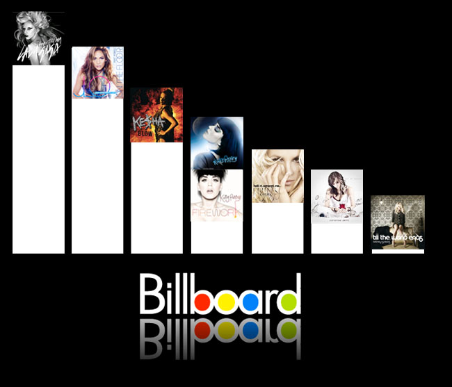 La lista de Billboard de la semana pasada dejó a Britney en muy mal lugar. La no promoción le ha pasado factura y quizás esto sea un toque de atención por parte del público. 'Hold It Against Me' ha caído hasta el 16 y 'Till The World Ends' ha debutado en un decepcionante 20, por debajo del single de una novata, Christina Perri con 'Jar Of Hearts'. La canción de la aleación nominal hecha de Aguilera y Katy se cuela en el ranking de divas con una canción que huye de la tendencia discotequera predominante.