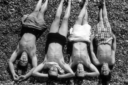 27 de febrero de 1938: Un grupo de jóvenes tomando el sol en la playa de Brighton. (John Waterman/Fox Photos/Getty)