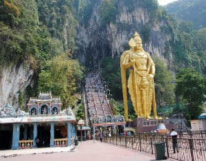 Las cuevas de Batu, uno de los lugares más famosos de Malasia, albergan un impresionante santuario hindú. Situado a unos 10 km al norte de Kuala Lumpur, cuenta con una gigantesca estatua dorada al pie de 272 empinados escalones que se suben para llegar a la entrada de la cueva.
