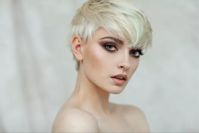 Otro peinado andrógino de bajo mantenimiento que puedes probar es el corte recortado, al que puedes dar un toque extra si te decantas por el rubio o el rubio sucio. El corte crop es un peinado corto y con textura que puede adornarse con un flequillo despuntado en la parte delantera, que también puede ayudar a cubrir una zona ancha de la frente.
