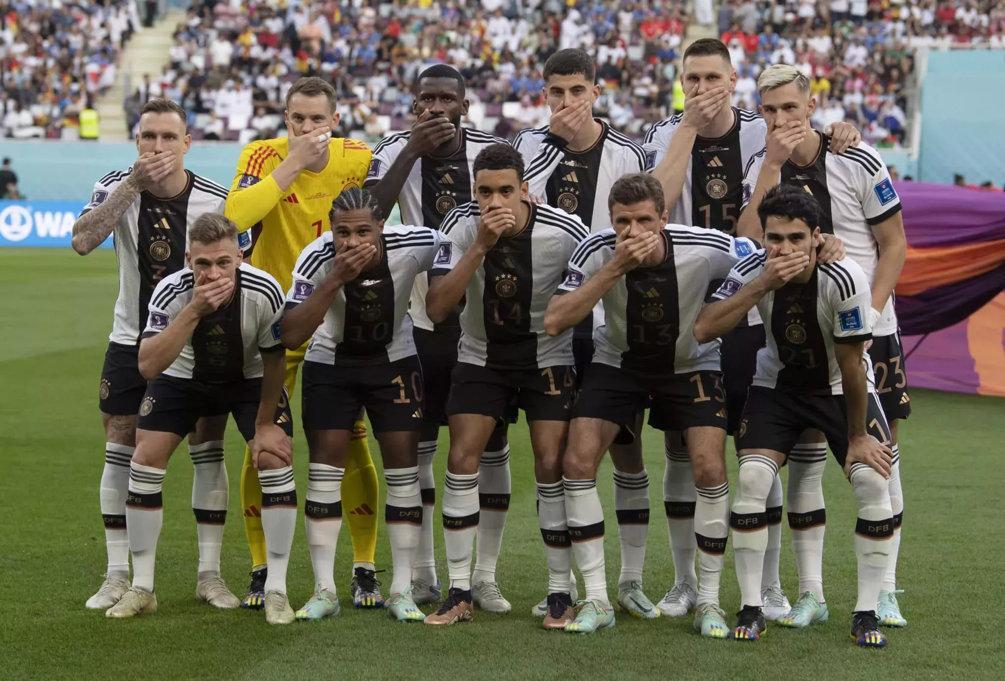 La selección alemana de fútbol posó con una equipación con las rayas del arco iris y las manos sobre la boca en protesta por la sanción de los brazaletes OneLove pro-LGBTQ+ durante el Mundial de Qatar.