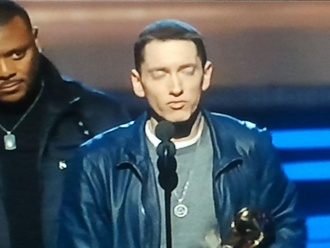 4.52 Nicki Minaj y Will.I.Am anuncian a Eminem como ganador al Grammy por mejor disco de Rap. Ya era hora de que le dieran algo a Eminem. Agradece a Rihanna, entre otros.