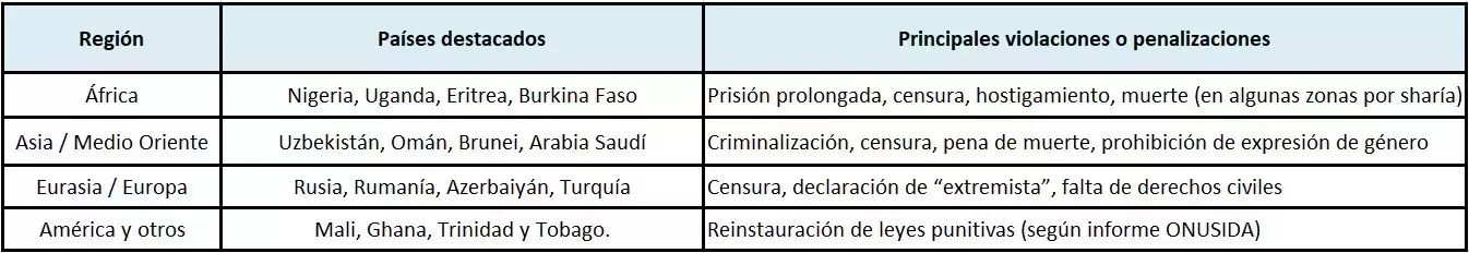 Un reciente informe de ONUSIDA alerta que, por primera vez en una década, varios países han adoptado o reinstaurado leyes punitivas específicas contra el colectivo LGBTI. Entre ellos se encuentran Mali, Uganda, Ghana y otros, lo que retrasa la lucha contra el VIH/SIDA y amenaza metas globales de salud pública.