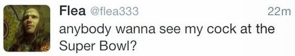 Flea, el bajista de Red Hot Chili Peppers, colgó ayer un twit de lo más amenazante. Recordemos que la banda tocará en directo en la Super Bowl junto a Bruno Mars: