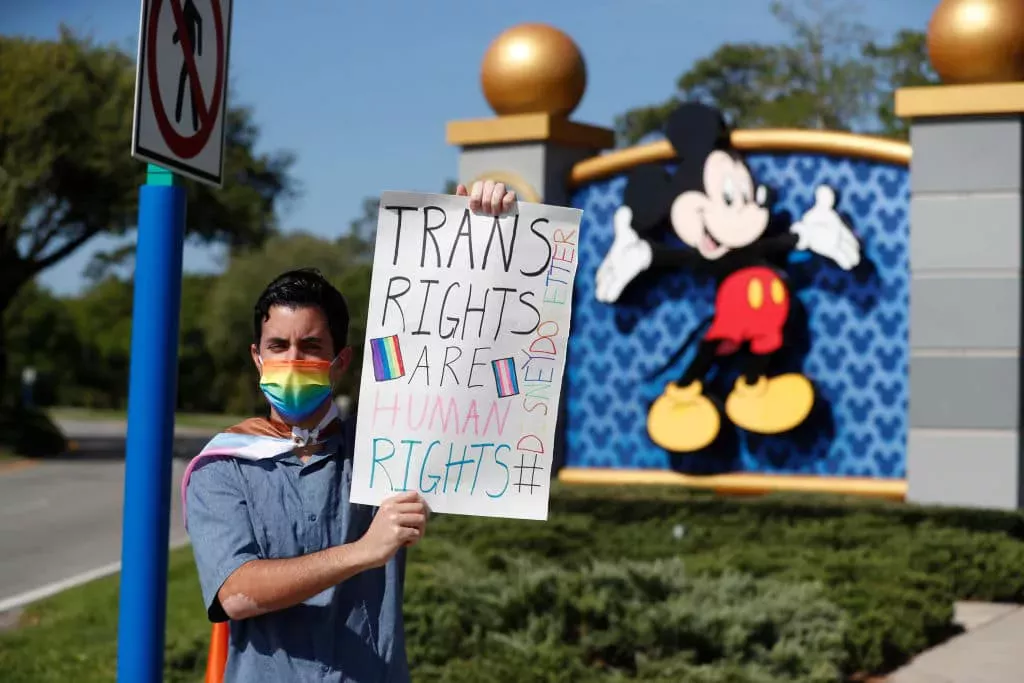 Fuera de la propiedad de Walt Disney World, el empleado de Disney Nicholas Maldonado fue un manifestante solitario el martes, llevando una bandera del arco iris y sosteniendo un cartel que decía: "Los derechos trans son derechos humanos" y "#DisneyDoBetter".