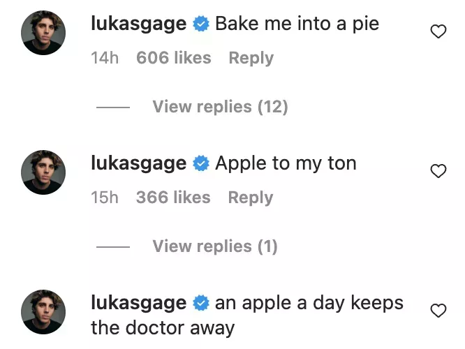 Gage respondió al comentario de "La manzana de mis ojos" diciendo: "Hornéame un pastel". Luego añadió: "Una manzana al día mantiene alejado al médico".