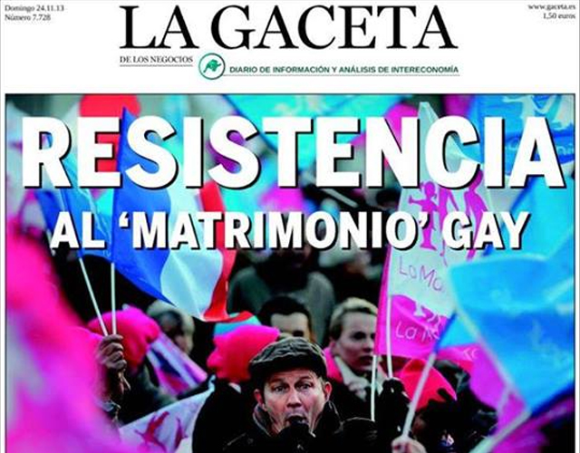 Debe ser que en España no ha pasado nada más importante ni hay nada con que llenar la portada un domingo, así que 'La Gaceta' demuestra una vez más su homofobia: "los franceses vuelven a llenar las calles un año después de la primera gran manifestación contra la unión de personas del mismo sexo, aprobada por el Senado en medio de una gran polémica". Ellos mismos en su artículo dicen que eran miles en la manifestación antigay cuando en 2012 eran un millón de franceses homófobos, o hablan de Jean-Pier, un homosexual francés en contra del matrimonio igualitario (!), o reseñan que "entre los homosexuales siempre ha habido una mayor promiscuidad e inestabilidad en las parejas" a la hora de hablar del divorcio de dos lesbianas francesas. ¿Qué te parece este bochornoso artículo al que 'La Gaceta' dedica su portada?
