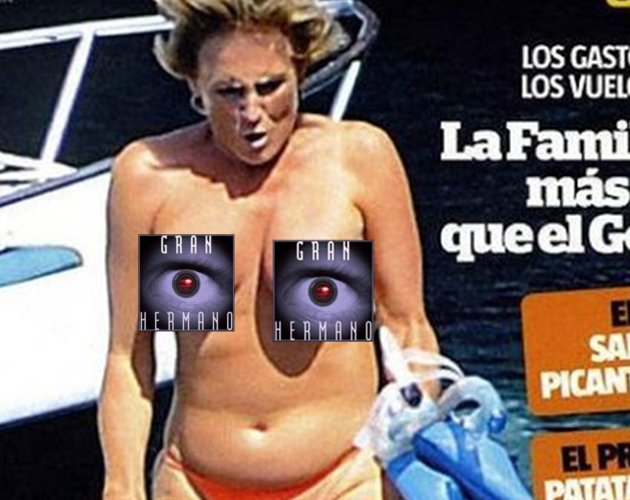 La presentadora meona se fue de vacaciones a Menorca con unas amigas este verano y los incansables objetivos de la revista la cazaron con las mamelles al aire. Hay que decir que, pese a salir saltando en dirección al agua, sale sorprendentemente bien para los 61 años que luce, aunque claro, lanzada contra el mar el cuelgue natural de los pechos se compensa. También creemos que algo de Photoshop debe haber, sino ¿Como se explica que tenga la piel más suave que el culito de un bebé?