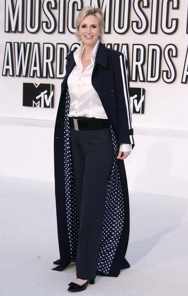 Jane Lynch, optó por la versión de "ir hecho un cuadro" con una especie de gabardina deportiva que le hacía un flaco favor.