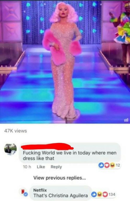 Esta vez ha tenido lugar en la página de Facebook de Netflix. El servicio de streaming cuenta con los capítulos de la nueva temporada de 'RuPaul's Drag Race' y sacó pecho anunciándolo con un post en el que aparecía la invitada del momento, Christina Aguilera. El homófobo de turno no tardó nada en contestar con la frasecita de marras: "Puñetero mundo en el que vivimos donde los hombres visten así".