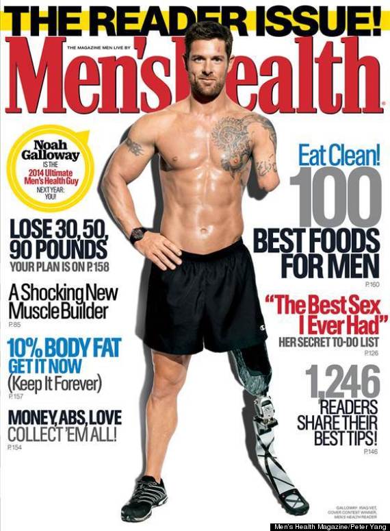Ahora, 4 años después, podemos ver a Noah Galloway desnudo de cintura para arriba en la portada del número de noviembre de Men's Health, luciendo musculatura y cuerpazo. El militar mutilado de Men's Health explica lo complicado que es hacer flexiones y otros ejercicios sólo con una mano, pero luce así de bien. ¡Bravo!
