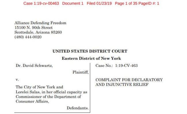En una presentación ante el tribunal federal el 23 de enero, el terapeuta de Brooklyn Schwartz alega que la prohibición de la terapia de conversión constituye una "violación directa de la libertad de expresión y del libre ejercicio de la religión", porque le impide intentar curar a sus pacientes de la homosexualidad.