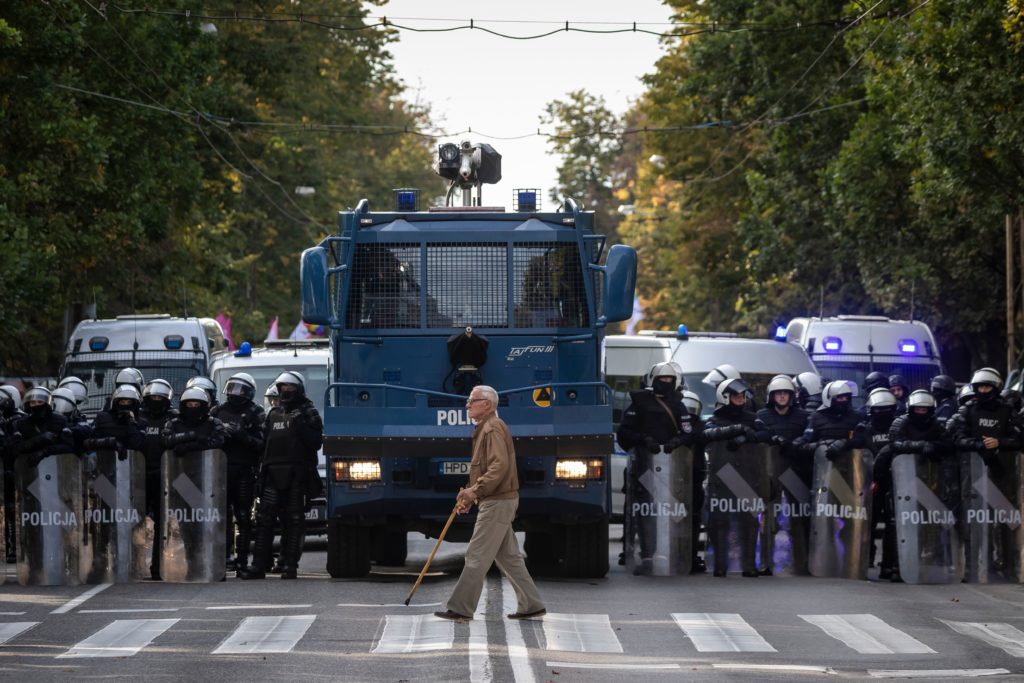 Un anciano pasa por delante de los agentes de la policía antidisturbios y de un cañón de agua que protege a los participantes del desfile del Orgullo Gay en Lublin, en el este de Polonia, el 28 de septiembre de 2019.