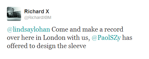 Mientras se emperra en ser buena actriz, con dramas y más dramas para total, terminar rodando tv movies de baja estofa, el productor británico de leyendas de la música como Rachel Stevens o Sophie Ellis-Bextor ha tomado Twitter para pedir públicamente a la protagonista de 'I Know Who Killed Me' que vaya a Londres a grabar con él. De hecho le ha encontrado hasta diseñador de portada. Aunque, siendo honestos, todo apunta a una noche de borrachera entre Richard y su amigo diseñador: la clásica noche que, entre alcohol, te dices "anda que no estaría bien producir el nuevo disco de Lindsay Lohan - Espera, que se lo twiteo!".