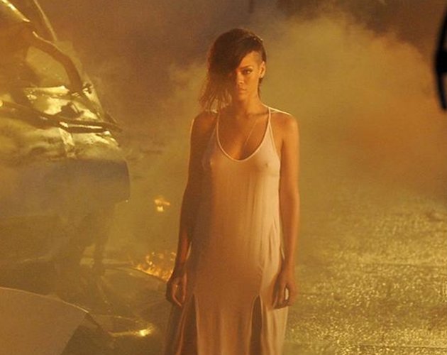 Esta semana ha tocado rodar el vídeo para 'Diamonds', su single tranquilito escrito por Sia y nada mejor que volver al fuego que tanto le gusta (sino recordemos 'Love The Way You Lie'). La futura novia de Chris Brown se ha vestido de largo, como si viniera de una boda, para rodar entre escombros en llamas. Lo típico, vamos. Algo nos dice que será uno de sus vídeos churros, pero quién sabe, quizás nos da la sorpresa.