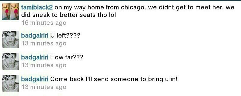 Pero Rihanna no contestó. Tami se situó en sus asientos para ver el concierto desde el Union Center de Chicago, disfrutaron del concierto y se fueron con un regusto amargo: se quedaron sin ver de cerca a la novia de Chris Brown. Llegaron al aparcamiento, se subieron al coche y empezaron su camino de vuelta. Tami colgó en su Instagram una foto de la carretera y de pronto, alguien contestó: