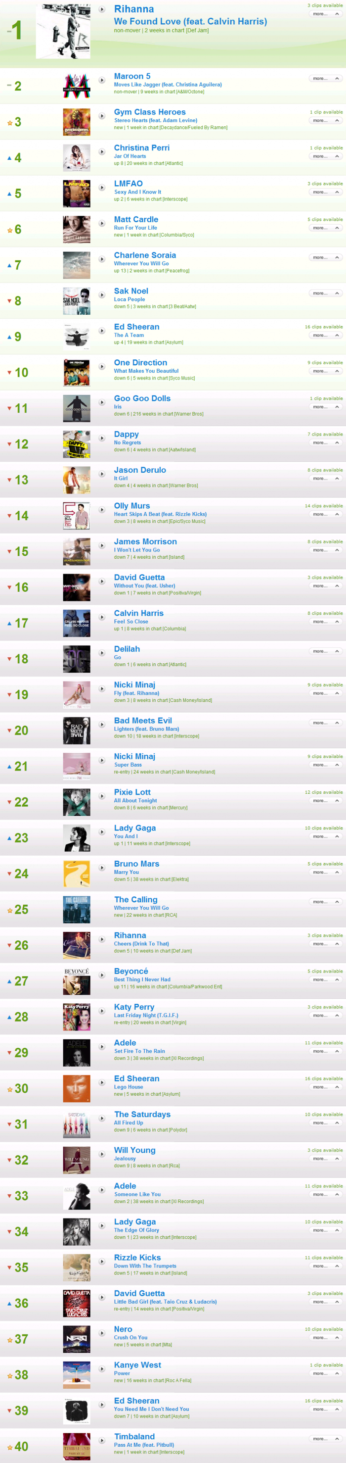 La verdad es que esta semana no ha habido cambios muy gordos. Maroon 5 sigue bien alto en la segunda posición con su colaboración con Christina Aguilera (que tiene el verdadero peso de la canción) y sólo hay dos entradas en el top 10: el número 3 para Gym Class Heroes y su 'Stereo Hearts' que, curiosamente, es un featuring Adam Levine, y Matt Cardle, que está histérico porque su single ha entrado en el 6 y teniendo en cuenta que es el ganador de 'X Factor' y sus competidores finalistas como One Direction o Cher Lloyd ya pueden presumir de números 1, no nos extraña nada.