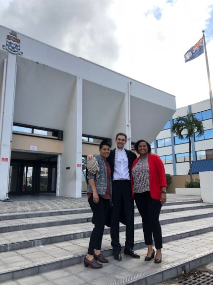 Chantelle Day, Peter Laverack y Vickie Bodden Bush frente a la corte de la Isla Caimán que legalizó el matrimonio entre personas del mismo sexo el 29 de marzo. (Suministrado)