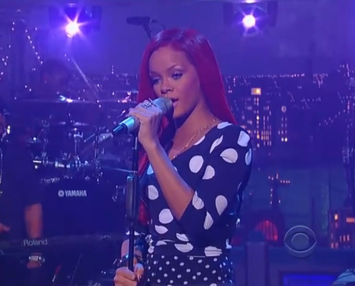 La nueva icono travesti cantó el segundo single de 'loud' en david letterman...