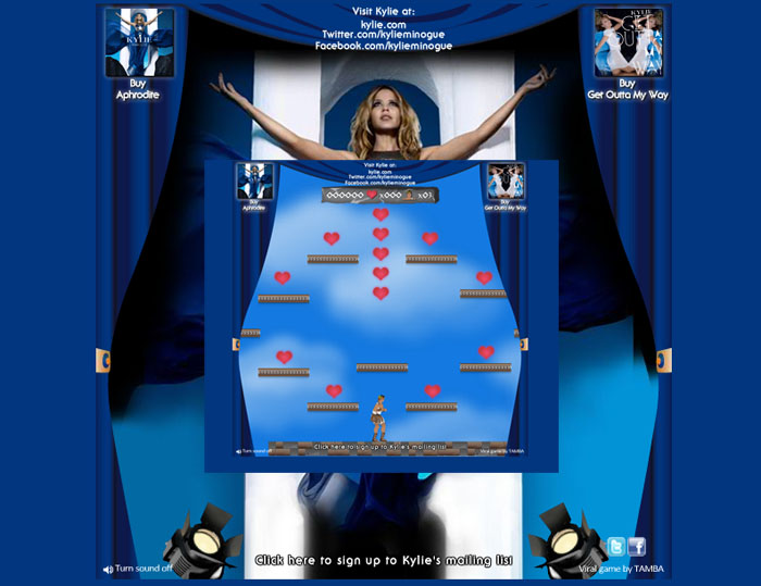 kylie minogue tiene un abanico de público muy amplio, seguramente por eso ha decidido que la mejor forma de promocionar 'get outta my way' es habilitando un juego on-line en el que el jugador es un hombrecito de la antigua grecia que tiene que ir recopilando corazoncitos para salvar a kylie...
