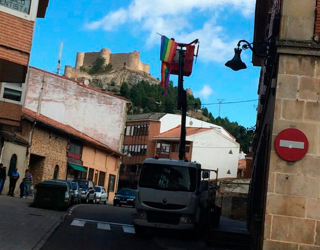 el pp envía un camión a retirar una bandera arcoíris en un pueblo en palencia... otra vez el pp contra el orgullo: envían este camión para quitar una bandera lgbt en un pueblo de palencia... el pp acaba de enviar un camión a retirar la bandera del orgullo del despacho de iu en aguilar de campoo, palencia... la alcaldesa del pp argumenta que es una bandera no oficial en un edificio público y no se puede colocar sin permiso... ha sucedido en aguilar de campoo, un pueblo en el que un edil de iu había colgado la bandera arcoíris en el balcón de su despacho... el concejal alberto garcía sánchez colocó la bandera el pasado lunes, pero este miércoles la policía municipal le llamó...