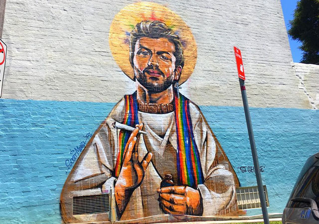 Muere george michael... george michael es "santificado" como el patrón del cruising... así fue la salida del armario de george michael en 1998... en sydney, un mural en homenaje a george michael se ha convertido en viral por diversas razones... una de las últimas y más sentidas muertes de 2016 fue la de george michael el mismo día de navidad... un artista y dj australiano ha decidido pintar toda una pared dibujando a un george michael como un santo, eso sí, con la bufanda arcoiris y un halo con los colores lgbt... "saint george, patrón santo de los parques por la noche", esa es la forma en la que le han llamado, en homenaje a la pillada en unos baños públicos a mediados de los 90 que dio la vuelta al mundo...