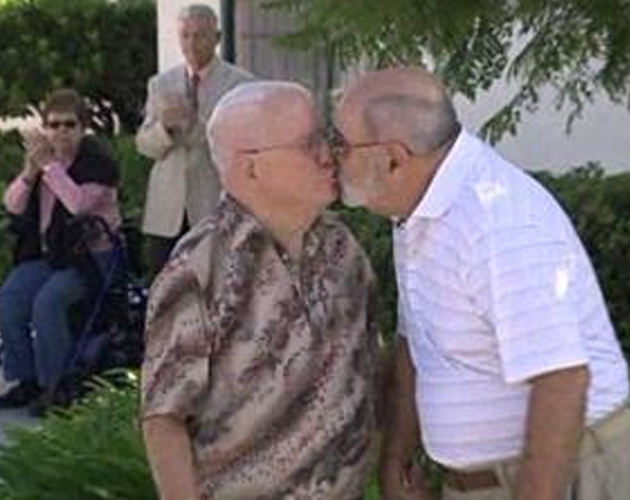 John y gerard han celebrado su boda gay en san diego, en la misma residencia para veteranos de guerra en la que viven, rodeados de sus amigos de la tercera edad... dos veteranos de guerra se casan tras 20 años viviendo juntos: john banvard, de 95 años, acaba de contraer matrimonio con gerard nadeau, de 67... uno es un veterano de guerra que estuvo en la segunda guerra mundial, y el otro estuvo en vietnam, ahí es nada... aunque algunos de sus compañeros no acaban de estar muy convencidos con la idea del matrimonio homosexual, en el siguiente vídeo uno de ellos habla de que, pese a sus creencias religiosas, cada uno debería tener el derecho a hacer lo que quiera... los dos han decidido contraer matrimonio tras dos décadas juntos y tras la decisió...