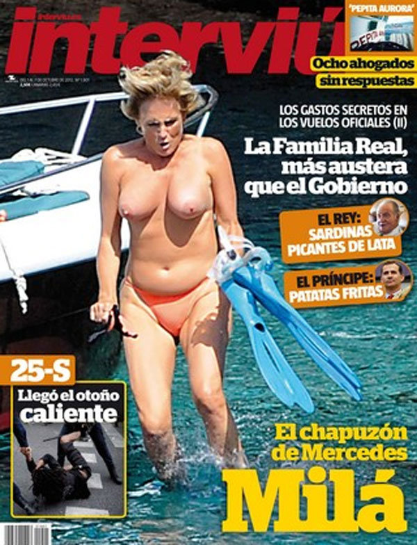Esperamos que merche se lo pasara bomba buceando en aguas menorquinas y que no aprovechara la ocasión para miccionar... aunque sí, hemos de reconocer que hacerlo en el mar es mucho más frecuente que hacerlo en la ducha... hay que decir que, pese a salir saltando en dirección al agua, sale sorprendentemente bien para los 61 años que luce, aunque claro, lanzada contra el mar el cuelgue natural de los pechos se compensa... la presentadora meona se fue de vacaciones a menorca con unas amigas este verano y los incansables objetivos de la revista la cazaron con las mamelles al aire... también creemos que algo de photoshop debe haber, sino ¿como se explica que tenga la piel más suave que el culito de un bebé?... en tetas, obviamente...