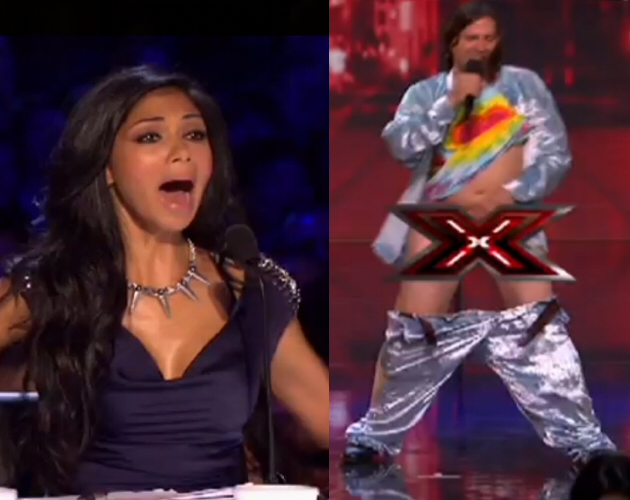 ... la cara de susto de nicole scherzinger es un poema, aunque la palma se la lleva paula abdul, que tuvo que salir del panel de jueces a vomitar en el backstage... en la versión televisada todo se cubrió debidamente con la x del programa, pero lo más interesante de todos es que, por muy americano que fuera el programa, nadie le detuvo y le dejaron terminar su interpretación...