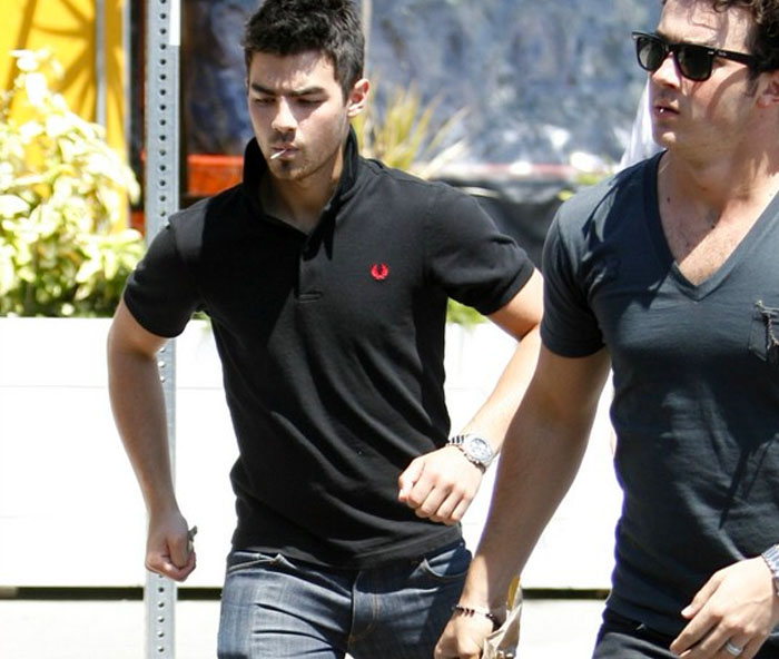 le acompañaba su otro hermano, kevin jonas, que es el que está casado y el que no se ha dado cuenta de que no le quedan nada bien las camisetas con cuello de "v" pronunciado... joe jonas de los jonas brothers está cambiando su estilo súper back&forth en estos últimos meses...