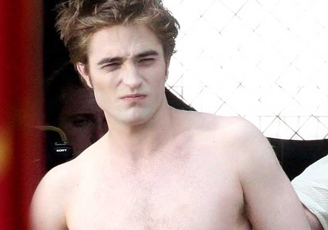 DOS PATTINSON SIN CAMISETA APARECEN ARRODILLADOS EN UNA CAMA
