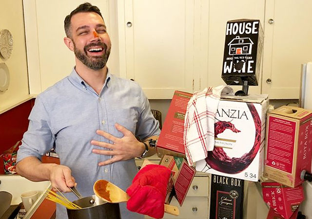 Si no tienes novio, te fabricas uno con cajas de vino... y, por supuesto, se ha montado un novio transformer con las cajas del vino que tanta felicidad le da... ha decidido que ya que en sus momentos de soltería el vino es su mejor acompañante (el gran tópico de los americanos, para los cuales el vino es la bebida alcohólica más fuerte), aprovechará las cajas y se hará un novio con ellas... y si están desesperados y no saben qué hacer, te proponemos la solución a la que ha llegado un artista: fabricarte tu novio con cajas de vino... se ha hecho fotos con él cocinando, yendo de compras al súper, juntos en plan cariñoso en casa o en un romántico parque... sí, sin duda michael james schneider...