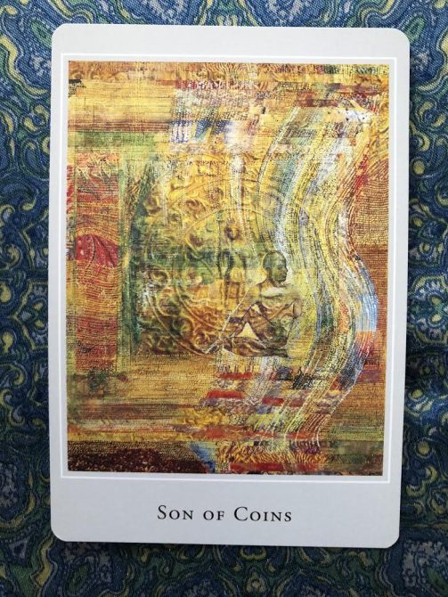 Las tarjetas de la corte aparecen para recordarnos quiénes somos. Hay dieciséis tarjetas de la corte y cada una sugiere un aspecto de nosotros mismos que necesita ser despertado. El Hijo de las Monedas (o el Caballero de los Pentáculos, como se les llama más comúnmente) eres tú cuando continúas comprometiéndote con tus sueños, hora tras hora, día tras día, incluso cuando parece imposible, especialmente cuando parece imposible.