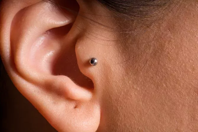 Por suerte, tu perforador puede evitar el cartílago de la oreja con un piercing superficial en el tragus. Aunque este piercing se encuentra en el mismo lugar que un piercing tragus estándar, la aguja no llega a perforar el cartílago, sino que entra y sale de la piel que lo cubre. Sin embargo, esta opción tiene una desventaja: una mayor probabilidad de que el cuerpo rechace el nuevo piercing.
