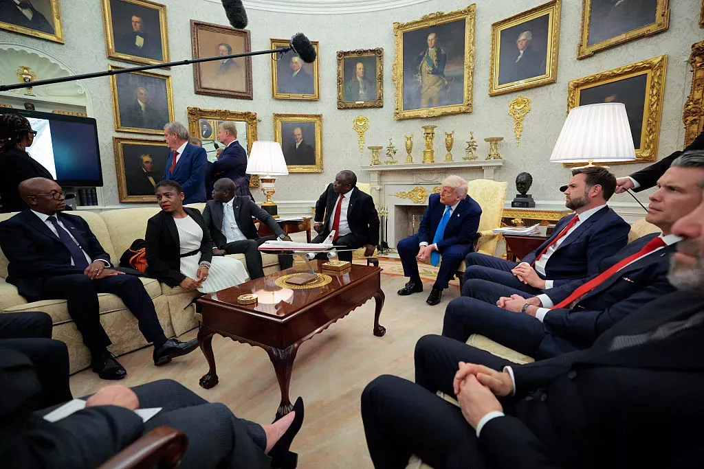 Presidente de Sudáfrica Cyril Ramaphosa (C-L) y el presidente de EE. UU., Donald Trump (C-R) observan un video en la Oficina Oval de la Casa Blanca el 21 de mayo de 2025, en Washington, D.C. Chip Somodevilla / Getty Images