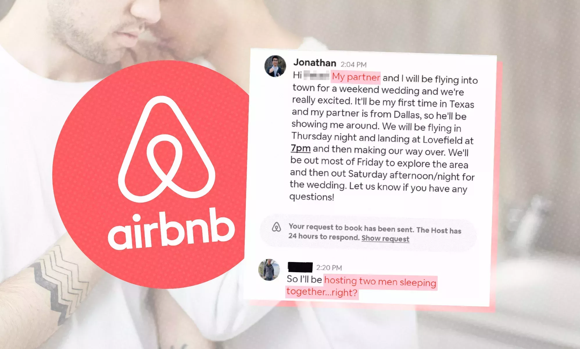 El dueño de la propiedad, cuyo nombre fue redactado por Kimberlin Jr, volvió preguntando: "Así que alojaré a dos hombres durmiendo juntos... ¿verdad?" - a pesar de que la pareja no mencionó explícitamente que fueran gays.
