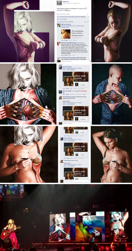 Vayamos por partes: el chico, Danny Quirk, realizó una serie de fotos/montajes con personas abriéndose en canal. Unas fotos muy sugerentes que han desatado la polémica. Primero Madonna retuiteó unos montajes con su cara encima de las fotos, realizados por un fan, y luego decidió utilizarlos en las pantallas del 'Rebel Heart Tour' durante la canción 'Rebel Heart' que dedica a todos sus fans con sus dibujos en pantalla.