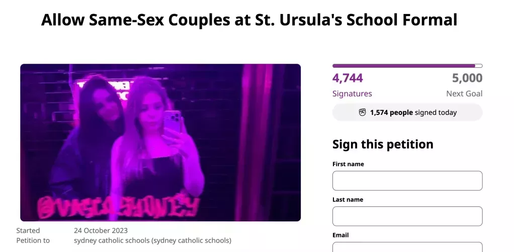 Un portavoz de las Escuelas Católicas de Sídney, que gestionan 147 centros educativos, declaró al Sydney Morning Herald que "tradicionalmente celebran la finalización del 12º curso mediante actos en los que, o bien los estudiantes no traen amigos o parejas, o bien traen amigos o parejas del sexo opuesto".
