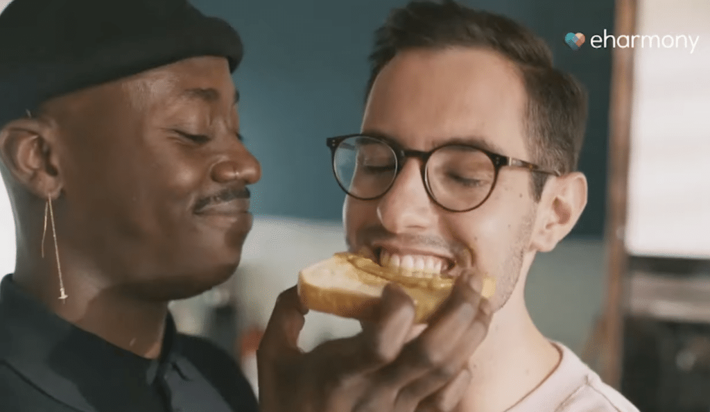 Un nuevo anuncio de la campaña "Here for Real Love" del sitio de citas eHarmony Australia muestra a una pareja gay preparando una tostada, untándola con mantequilla de cacahuete, antes de comerla y compartir un abrazo.