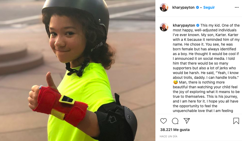 En un extenso puesto de Instagram, el hombre de 48 años compartió una fotografía de Karter usando equipo de seguridad. Escribió: "Este es mi hijo. Uno de los individuos más felices y bien adaptados que he conocido. "Mi hijo, Karter. Karter con K porque le recordaba mi nombre. Él lo eligió. Verás, nació mujer pero siempre se identificó como un niño."Pensó que sería genial si lo anunciara en los medios sociales. Le dije que habría muchos partidarios pero también muchos imbéciles que serían duros. "Él dijo: 'Sí, sé sobre los trolls, papá. Puedo manejar los trolls. "Hombre, no hay nada más hermoso que ver a tu hijo sentir la alegría de explorar lo que significa ser fiel a sí mismo. Este es su viaje, y yo estoy aquí para él. "Espero que todos tengan la oportunidad de sentir el amor insaciable que estoy sintiendo ahora mismo."