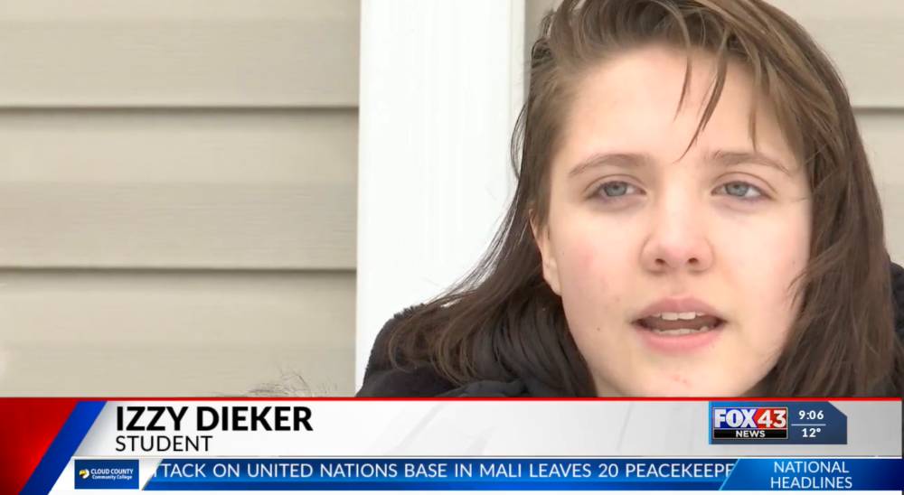 Izzy Dieker, alumna de octavo curso de la escuela Americus del distrito del condado de North Lyon (Kansas), declaró que la echaron del autobús escolar después de que dijera a sus amigas "soy lesbiana". Dice que un conductor de autobús la escuchó haciendo la declaración a sus amigas y la denunció por "lenguaje inapropiado".