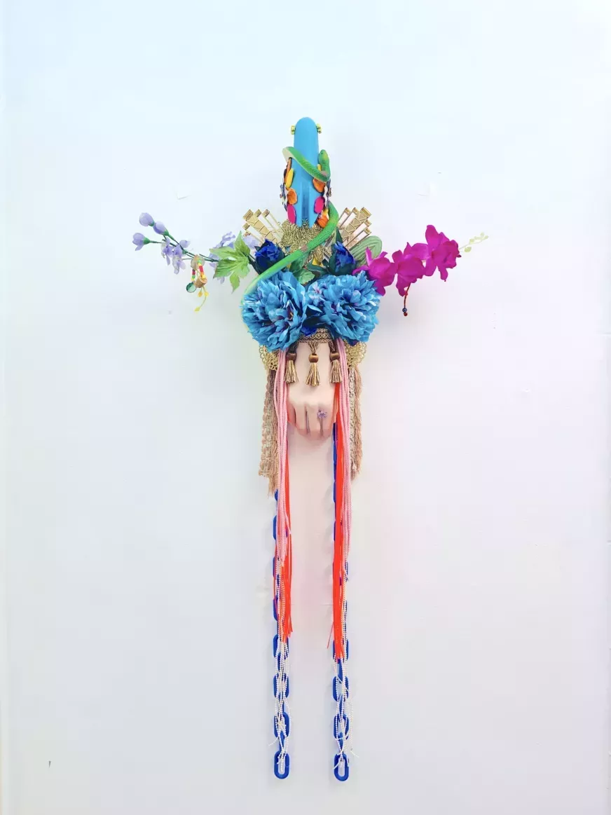 Juan Hinojosa, "Post - Obit", 2021. Pintura, flores sintéticas, joyas, cadenas de plástico, cuentas, pájaro de madera sobre madera.