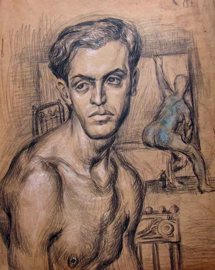 Bernard Perlin, "Quentin Fiore", 1937. Grafito y lápiz blanco sobre papel marrón.