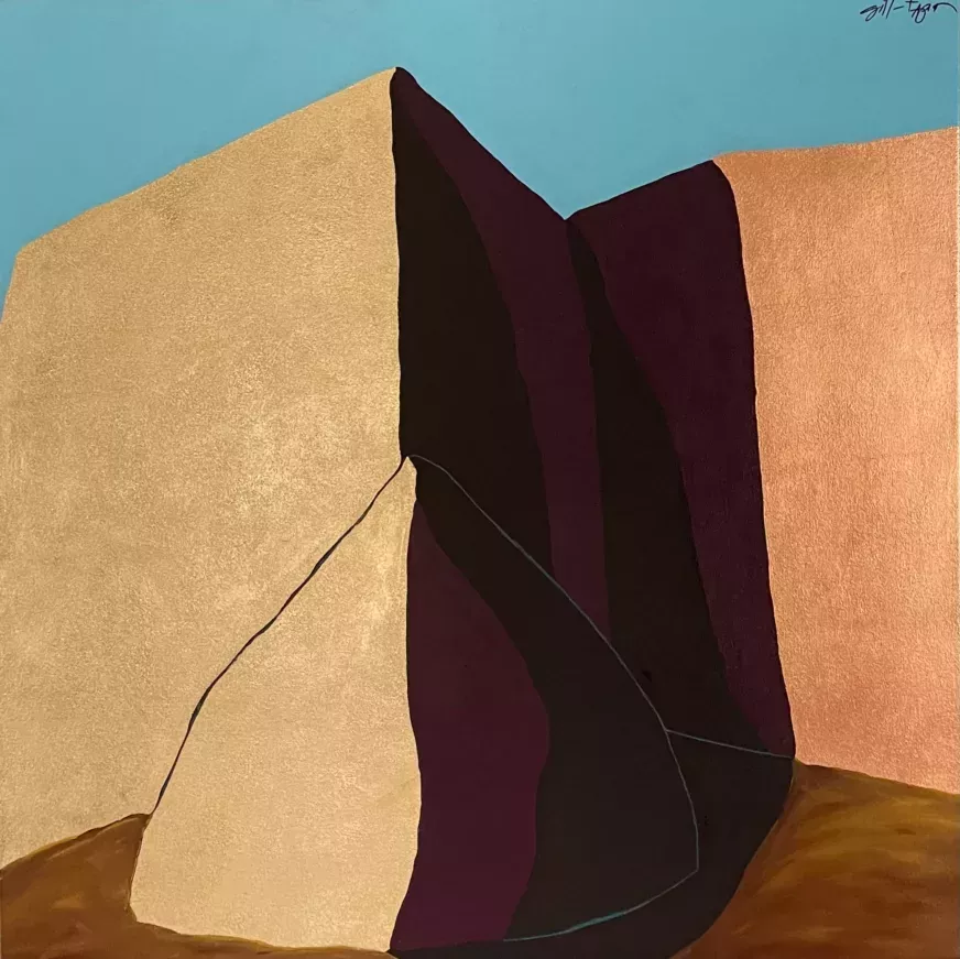 Alvin Gill, "Tapia Brisk Morning - Taos, Nuevo México", 2022 Plomo dorado y cobre y acrílico sobre lienzo.