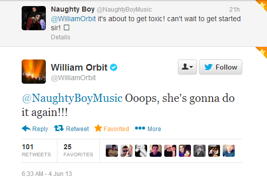 No sabemos si oficialmente se refiere al disco de Britney, pero cuando Naughtyboy le contesta y Orbit replica, lo confirman del todo: