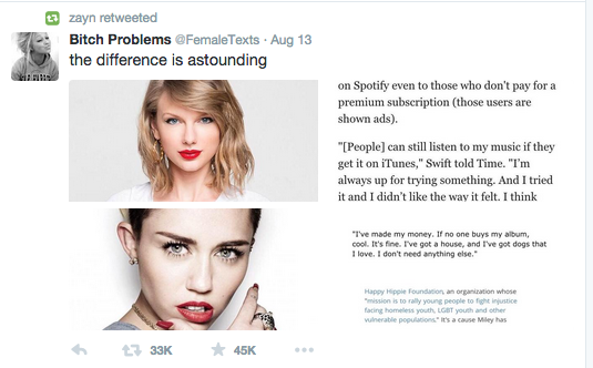 Todo empezó cuando Zayn retuiteó un mensaje en el que comparaba dos declaraciones: la de Taylor Swift pidiendo a sus fans que paguen por su música contra las de Miley Cyrus que asegura que ya tiene dinero para vivir feliz y que si no vende un disco más le da igual.